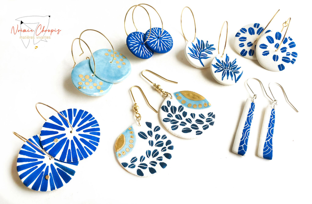 Boucles d'oreilles en porcelaine parsemé d'or - Créole plaqué or Diamètre environ 4cm. Chaque pièce est modelée à la main, ce qui implique l'éventualité de certaines irrégularités de formes et de couleurs d'un bijoux à l'autre. Livraison 5€/