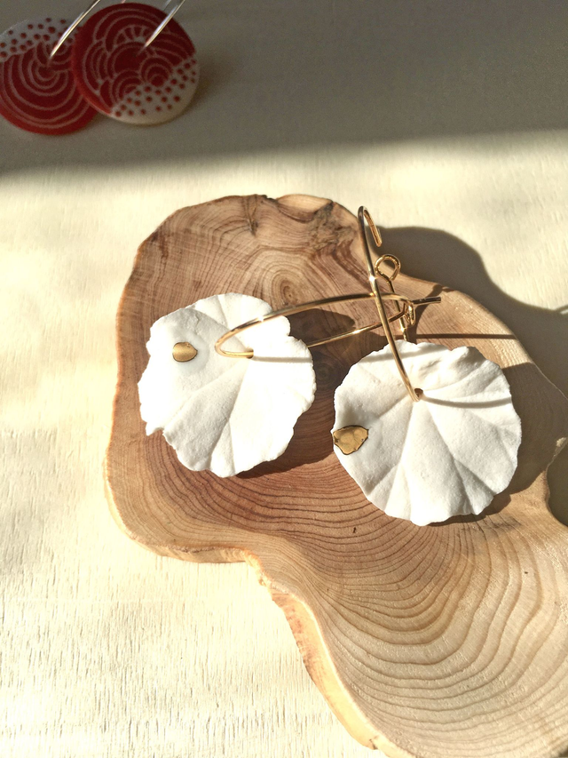 Boucles d'oreilles en porcelaine parsemé d'or - Créole plaqué or Diamètre environ 2cm. Chaque pièce est modelée à la main, ce qui implique l'éventualité de certaines irrégularités de formes et de couleurs d'un bijoux à l'autre. Livraison 5€/